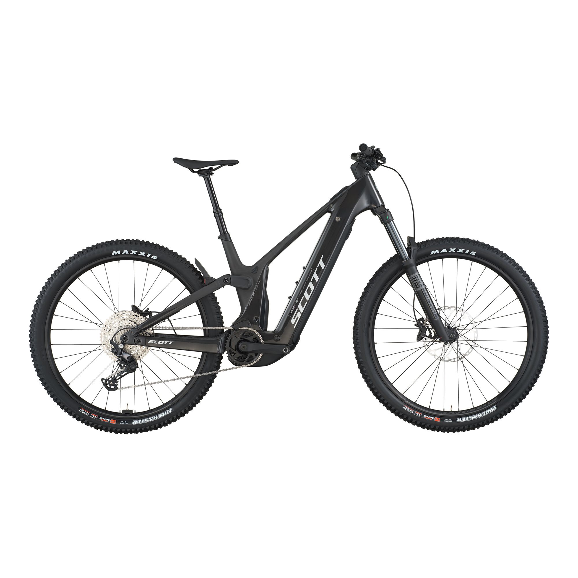 – Bakdämpare: X-Fusion NUDE 5 RLX Trunnion, SCOTT custom, 3-lägen (Lockout / Traction Control / Descend), justerbar rebound, slag 150–100 mm, T185x55 mm